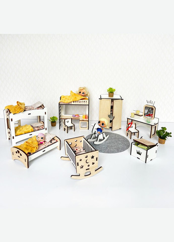 Мебель для кукольного домика в эко стиле - для кукол высотой до 12 см. Набор "Спальня + Детская" отлично подходит для кукол LoL, а также других небольших кукол и пупсов. Мебель собирается без шурупов, для придания дополнительной прочности необходимо обязательно места соединений входящих в пазы - проклеивать клеем ПВА D3 (Идет в комплекте). Характеристики: материал - ХДФ (прессованная эко древесина) и фанера, краска водоэмульсионная безопасная для детей; цвет - белый + натуральное дерево. Комплектация: двухъярусная кровать; одноместная кровать; кровать + стол; стульчики 2 шт.; шкаф; люлька; ящик для игрушек; лошадка-качалка; туалетный столик с зеркальцем; пошаговая инструкция по сборке; специальный клей ПВА D3. Отправляется в разобранном виде.