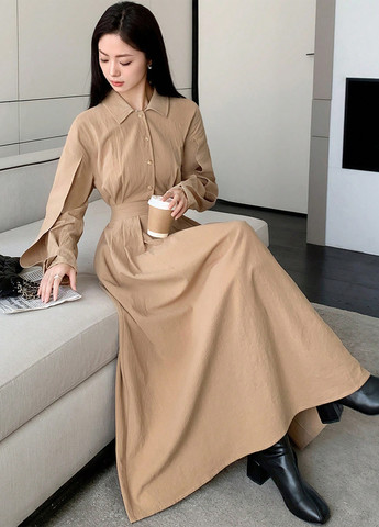 Материал Хлопок / Цвет Бежевый / Фасон Платье-рубашка / Длина изделия Макси / Стиль Кэжуал