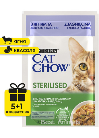 Влажный корм для стерилизованных кошек Cat Chow Sterilised содержит все необходимое для того, чтобы ваш любимец имел полноценную и здоровую жизнь. Преимущества: полнорационный влажный корм для кастрированных кошек старше 1 года; является сбалансированным рационом, обеспечивающим организм любимца необходимыми питательными веществами; изготовлен из высококачественных натуральных ингредиентов, благодаря чему корм обладает отличными вкусовыми характеристиками и привлекательным ароматом; нежные кусочки заправлены аппетитным желе, которое делает поданное блюдо сочным и легким для усвоения; содержит витамины, железо, йод и цинк, комплексно укрепляющие и защищающие организм любимца; с добавлением таурина, жизненно важной для кота аминокислоты, поддерживающей его зрение и сердечно-сосудистую систему; помогает сбалансировать основной рацион кота, таким образом активизируя его обмен веществ и улучшая самочувствие; без добавления искусственных ароматизаторов и консервантов. Состав: мясо и субпродукты животного происхождения (из которых ягненок 4%), экстракты растительного протеина, рыба и продукты переработки рыбы, минеральные вещества, овощи (0,9% дегидратированной зеленой фасоли, что эквивалентно 8,1% зеленой фасоли), продукты переработки. Питательные кормовые добавки: витамин А 1000 МЕ/кг; витамин D3 139 МЕ/кг; сульфат железа (Fe 12) мг/кг; йодат кальция (I 0,3) мг/кг; сульфат меди (Cu 0,9) мг/кг; сульфат марганца (Mn 1,6) мг/кг; сульфат цинка (Zn 17) мг/кг; таурин 455 мг/кг.