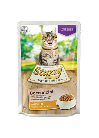 Влажный корм для котов Stuzzy Cat Sterilized Chicken – сбалансированный восхитительно вкусный рецепт с курицей. Приготовленные на пару из натуральных ингредиентов кусочки с высоким содержанием мяса и ароматным соусом – ваш кот не устоит перед этим соблазнительным блюдом. Корм обогащен набором основных витаминов и минералов. Состав консервов адаптирован для стерилизованных кошек и кастрированных котов: увеличено содержание протеина и клетчатки и снижено количество жира (по сравнению с аналогичными влажными кормами Штузи) для поддержания здорового веса и активности вашего питомца. Подходит в качестве дополнения к основному рациону и может применяться как полнорационный корм. Stuzzy – качественные деликатесы на каждый день.