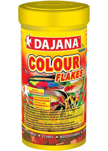 Корм Dajana Gold Colour Flakes содержит высокую долю водорослей, обеспечивает богатство естественной окраски красных, желтых и оранжевых цветов. Высококачественный и полноценный растительный состав корма, гарантирует высокую усвояемость организмом рыбок, поэтому, - вода в вашем аквариуме становится более чистой и здоровой.