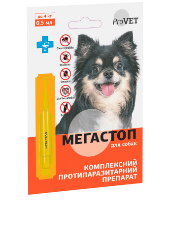 Мега Стоп ProVET до 4 кг1уп.(1 пипетка*0,5мл) для собак (инсектоакарицид, антигельминтик). Прозрачная масляная жидкость со специфическим запахом составляющих компонентов. Состав и фармакологические свойства Для собак: 1,0 мл препарата содержит действующие вещества: имидаклоприд - 100 мг, ивермектин - 25 мг. Вспомогательные вещества: Н-метилпирролидон, кислота лимонная, ПЭГ-400. Препарат обладает высокой эффективностью против эктопаразитов, таких как блохи, кожные клещи (отодектозные, демодекозные и др.), и эндопаразитов: нематоды, дирофилярии (эффективен против личинок L3 и L4 стадии). В состав препарата входит имидаклоприд, который действует на рецепторы нервной системы эктопаразитов, прерывает передачу нервного импульса, что приводит к параличу и последующей гибели паразита. Имидаклоприд не проникает через гематоэнцефалический барьер, поэтому не влияет на центральную нервную систему млекопитающих. Ивермектин имеет выраженную противопаразитарное действие на личиночные и половозрелые формы нематод. Показания к применению Профилактика и лечение животных при поражении блохами, кишечными нематодоз, чесоточный клещ (Otodectes cynotis, Notoedres cati, Sarcoptes canis), демодекозом, а также профилактика дирофиляриоза (эффективен против личинок L3 и L4 стадии). Способ применения и дозировка Препарат применяют животным только внешне, путем нанесения на сухую неповрежденную кожу, предварительно раздвигая шерсть. Наносят препарат у основания черепа или между лопатками. Большим собакам массой тела более 20 кг содержимое пипетки наносят на 3-4 точки вдоль позвоночника, начиная между лопаток и заканчивая у основания хвоста. После обработки препаратом домашних животных не купают в течение трех дней. Препарат обеспечивает защиту до 30 дней. При поражении чесоточными и демодекозного клещами обработку проводят 2-3 раза с интервалом в 10 дней. Противопоказания Не применять больным и ослабленным животным. Не применять щенкам в возрасте до 10-ти недель. Хранение Препарат хранят в закрытой оригинальной упаковке в сухом, недоступном для детей и животных месте, отдельно от пищевых продуктов и кормов, при температуре 0 30 ° С. Срок годности: 3 года.