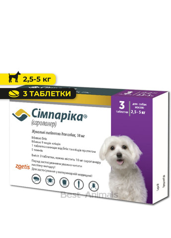 Симпарика - жевательная таблетка со вкусом печени, представляет собой препарат нового поколения для защиты собак от блох и клещей. Благодаря своей эффективности уже через 8 часов после применения средство проявляет активность против всех видов блох, паразитирующих на собаках, и через 12 часов оказывает действие на клещей. После приема препарат всасывается в кровоток пса, максимальная концентрация токсина в плазме достигается через три часа. Сароланер влияет на нервную систему паразитов, что приводит к их гибели. В течение первых 12 часов гибнут все присутствующие вредители. Последующие интоксикации клещами возможны, однако насекомое умирает, не успев отложить яйца в шерсти четвероногого друга, таким образом, снижается риск заражения эктопаразитом подстилки животного и среды обитания. Лекарство можно купить в зоомагазине или заказать на сайте. Препарат Симпарика от глистов, клещей, блох для щенка и собак, выпускается в разной дозировке, исходя из веса кобеля: вес 1,3-2,5 кг – одна таблетка 5 мг; вес 2,6-5,0 кг – одна таблетка 10 мг; вес 5,1-10,0 кг – одна таблетка 20 мг; вес 10,1-20,0 кг – препарат содержит 40 мг действующего вещества; вес 20,1-40,0 кг – препарат содержит 80 мг действующего вещества; вес 40,1-60,0 кг – препарат содержит 120 мг действующего вещества. Собакам, чей вес превышает 60 кг – применяют комбинацию препарата Симпарика. Допустимо лечение клещевых инвазий у щенков не раньше 8 недельного возраста. Важным аспектом противопразитарной терапии выступает правильное применение препарата: собака должна полностью съесть таблетку Симпарика. Как правило, с этим не возникает проблем, поскольку лекарство имеет аппетитный печеночный вкус. Если вы хозяин очень капризного четвероногого друга, рекомендуется вмешать таблетку в корм. Для сохранения эффективности запрещено разделять таблетку. Антиблошинная терапия проводится ежемесячно в период активности эктопаразитов, поэтому рекомендуем купить таблетки от клещей Симпарика, с наступлением первых теплых дней, цена зависит от дистрибьютора. Поскольку Сароланер отличается низкой токсичностью, побочные эффекты от приема Симпарики сведены к минимуму. Однако, если вы заметили индивидуальную непереносимость животного к компонентам средства, лечение необходимо остановить. Клоп не паразит от укусов которого защищает препарат. На сегодняшний день таблетки Симпарика завоевали любовь большого количества владельцев собак, цена на лекарства зависит от дозировки, подобрать и купить необходимое средство можно в интернет-магазине E-ZOO. Перед применением препарата проконсультируйтесь с ветеринаром и ознакомьтесь с нижеприведенной ИНСТРУКЦИЕЙ! ! ! Инструкция по ветеринарному применению лекарственного препарата Симпарика (Simparica) Организация-разработчик: «Zoetis Inc», 10 Sylvan Way, Parsippany, New Jersey 07054, USA I. Общие сведения Торговое наименование лекарственного препарата: Симпарика (Simparica). Международное непатентованное название: ролланер. Лекарственная форма: таблетки для перорального применения. Симпарика выпускают в шести дозировках, содержащих в 1 таблетке в качестве действующего вещества саролaнep 5, 10, 20, 40, 80 и 120 мг, а также вспомогательные вещества: лактоза, натрия карбоксиметил крахмал, кремния диоксид коллоидный, магния стеа. По внешнему виду таблетки квадратной формы с надписью на одной стороне таблетки: «5» (д