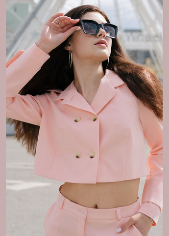 Короткий двухбортный жакет с подкладкой персикового цвета Этот стильный короткий персиковый жакет с подкладкой имеет стильный двухбортный дизайн. Впереди шесть пуговиц, из которых три декоративных и три функциональных, придают элегантности. Воротник со стойкой, а также отрезной отложной заостренный воротник (8 см) по косой придают жакету роскошный вид. Задняя часть украшена встречной складочкой, подчеркивающей элегантность. Длинные рукава с широкой патой (10 см) и две декоративные пуговицы завершают образ.