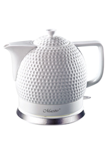 Электрочайник Maestro MR067 станет практичным и удобным обновлением для кухни. Он сочетает в себе качество и эстетичность, впишется в современный дизайн кухни. Внутри установлен фильтр, разработанный из нейлона. Так как поверхность окрашена в белоснежный оттенок и однотонная, она удачно впишется в современный дизайн кухни. Корпус изготовлен из керамики, которая отличается долгим сроком эксплуатации. Нет риска перегреть механизм, так как он не включится, если внутри нет жидкости. После максимального закипания чайник сам отключится. Работает прибор с мощностью в 1200 Вт, поэтому справляется с функцией максимально быстро. Характеристики электрочайника Maestro MR067 Тип: электрочайник Мощность, Вт: 1200 Объем, л: 1,5 Тип нагревательного элемента: дисковый (скрытый) Материал корпуса: керамика Цвет: белый Поворот на подставке Современный дизайн Скрытый нагревательный элемент Покрытие нагревательного элемента из нержавеющей стали Автоотключение при отсутствии воды Наличие фильтра Фильтр нейлоновый Защита от перегрева: есть Автоматическое отключение