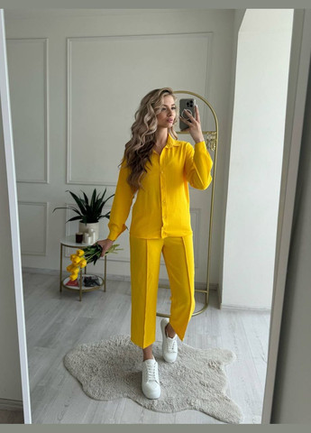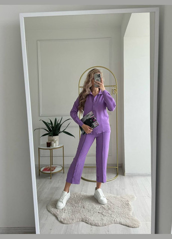 Костюм изготовлен из американского крепа с фактурой легкой жатки и принтованного софта. Ткани имеют минимальную растяжимость. Благодаря своему свободному фасону хорошо садится по фигуре. Футболка с короткими рукавами без манжетов, плечевой шов находится на естественной линии плеча. Также она имеет круглый вырез воротника, небольшие разрезы и удлиненную спинку. Брюки фасона палаццо с высокой посадкой, талия на резинке без застежек. По бокам вшиты лампасы и два кармана в шве.