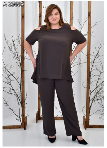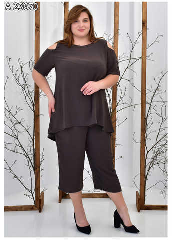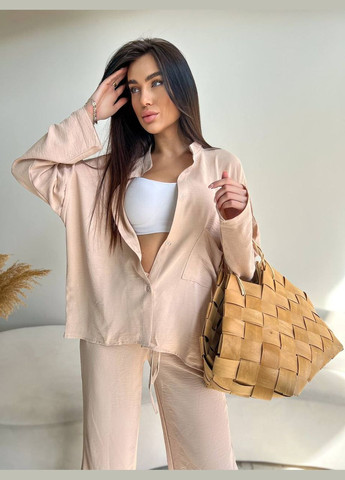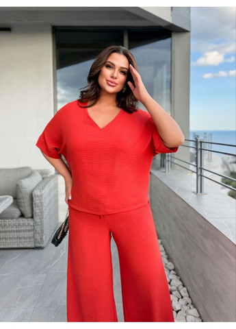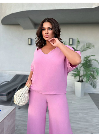 Стильный костюм свободного кроя из американского крепа жатки. Модель отлично садится по фигуре, не ущемляет движений, подходит для повседневного использования. Качественный пошив и современные цвета – идеальный выбор для лета.