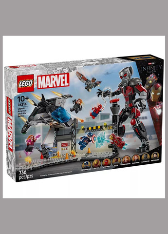 Игра Отправляйтесь в легендарное супергеройское приключение с конструктором LEGO Marvel! Этот набор воспроизводит незабываемую сцену битвы в аэропорту фильма Первый мститель: Противостояние и подарит часы увлекательных игр. В наборе: 9 минифигурок с детализированными костюмами, оружием и аксессуарами: Капитан Америка, Зимний солдат, Ванда, Сокол, Железный человек, Человек-Паук, Черная Вдова, Черная Пантера и огромная фигурка Человека-Муравьи (24 см высотой). Самолет Квинджет с открывающейся кабиной, сложными крыльями и местом для пилота. Детали для детализированной сцены аэропорта, которая включает взрывную бочку для дополнительной динамики игры. Приложение LEGO Builder поможет масштабировать и возвращать модели при конструировании для еще большего удовольствия. Этот конструктор открывает нескончаемые возможности для творчества, позволяя воспроизводить эпические сцены из фильма или создавать собственные супергеройские приключения. Идеальный подарок для фанатов Marvel всех возрастов! Развитие Игра с конструкторами прекрасно развивает мелкую моторику рук, стимулирует и улучшает пространственное и образное мышление, логику, координацию движений. Особенности: Бренд: LEGO; Страна бренда: Дания; Страна производства: Чехия; Рекомендуемый возраст: от 10 лет; Материал: пластик: Габариты упаковки: 7х26х38 см; Вес: 980 г; Количество деталей: 736.