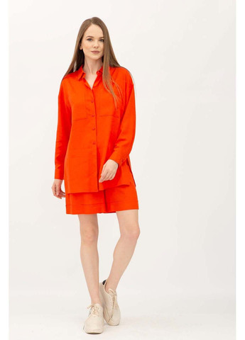 Готовый образ действительно красивой женской одежды – летний костюм для женщин из натурального льна в ярком оранжевом цвете. Шорты свободного кроя фиксируются на пуговицу с гульфиком, являются выточками спереди, за счет приточного пояса на резинке удобно садятся по фигуре. Свободная блуза с отложным воротником-стойкой, с двумя накладными карманами и боковыми разрезами, элегантно подчеркивает фигуру за счет удлиненного кроя и красивой складки по спинке. Такой женский костюм из льна – идеальный вариант для теплых вечеров и отпуска.