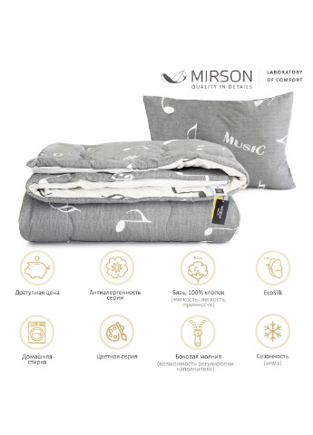 Здоровый сонПолезные компоненты бамбукового волокна улучшают кровообращение, нормализуют функцию сна, способствуют выводу из организма ионов тяжелых металлов. Материал имеет природную защиту от бактерий и патогенных грибов, эти свойства сохраняются и после обработки сырья, поэтому людям страдающим на аллергию, особо важно обратить внимание на этот наполнитель!Бамбук обладает повышенной гипоаллергенностью. Он подходит для чувствительной кожи. Текстиль из бамбукового волокна создает комфортный микроклимат чем обеспечивает долгий и здоровый сон!Ткань итальянский микросатинВ состав ткани входит хлопок и полиэфирное волокно, которые придают изделию мягкость, легкость, прочность и простоту в уходе. При этом наполнитель проявляет в данном чехле все свои самые лучшие качества и свойства. Наполнитель БамбукДля изготовления изделий из бамбукового волокна используют 100% натуральный бамбук, который изготовлен механическим способом без применения химических веществ. Экологически чистый, натуральный, мягкий, воздушный – это лишь небольшой перечень свойств, за которые миллионы людей отдают предпочтение данному наполнителю. Изделия из бамбука способны к самовентиляции, то есть не впитывают запахи, сохраняют тепло и приятны на ощупь, легкие, но в то же время теплые. Основным преимуществом бамбукового волокна является элемент bamboo kun, который обладает противомикробным эффектом и антибактериальными свойствами, придает ему мягкость и шелковистость. Стеганая технология пошиваПреимущество данной технологии заключается в том, что наполнитель равномерно распределен и простеган по периметру одеяла, тем самым не сбивается в углы. Прострочка оттеняет естественность и натуральность материалов, оттеняя их индивидуальность и качество. Прошитые швы и аккуратно простеганные стежки создают фактуру авторской коллекции, контролируя качество продукции. Одеяла окантованы красивыми кантами созвучно с коллекцией, что отличает их среди других одеял и придает дополнительную прочность всему изделию. На этапе производства все изделия проходят тщательный контроль качества. Вы можете быть уверены в том, что данное изделие выполнено исключительно из высококачественных материалов. Премия ГодаДесятки тысяч семей по достоинству оценили качество продукции ТМ MIRSON. Наша награда — это Ваша оценка. Мы создаем продукцию для удовлетворения Ваших высоких требований.