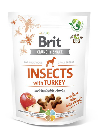 Дополнительный функциональный корм с белком насекомых, индейкой и яблоками для собак. Хрустящие и аппетитные косточки будут смаковать вашему любимцу. И это без риска, что он наберет лишний вес. • Белок насекомых – отличная усвояемость и низкий риск аллергии • Поддерживает идеальную массу тела • Высокое содержание жирных кислот для здоровой кожи и блестящей шерсти • Упаковка подлежит переработке • Низкий углеродный след • Сделано в ЕС Это вкусное и полезное вознаграждение! Состав: протеин из насекомых (26%), горох, индюшиный протеин (14%), картофельный крахмал, кокосовое масло, сушеные яблоки (5%), льняное семя (4%), гидролизованная куриная печень, сушеные водоросли (1%, Schizochytrium limacinum), рапсовое масло. Не содержит красителей и консервантов. Без ГМО. Аналитические компоненты: сырой протеин 26,0%, сырой жир 13,0%, влажность 10,0%, сырая зола 6,5%, сырая клетчатка 3,0%, кальций 1,0%, фосфор 0,6%, натрий 0