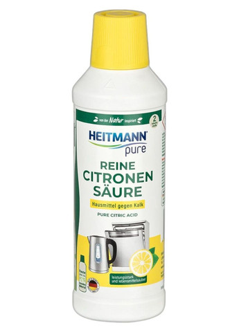 Жидкое средство для удаления накипи Heitmann Pure Reine Citronensäure 500 мл – экологически чистое и эффективное средство на основе чистой лимонной кислоты, предназначенное для удаления известкового налёта и накипи с бытовых приборов и поверхностей. Идеально подходит для чайников, кофеварок, стиральных машин, утюгов, кранов и душевых лейек. Средство не имеет резкого запаха, действует мягко, но эффективно, не повреждая материалы. ✔ 100% чистая лимонная кислота ✔ Подходит для чайников, кофеварок, стиральных машин, ванных ✔ Безопасно для кухонной техники ✔ Без запаха и красителей ✔ Объём: 500 мл Способ применения: Использовать согласно инструкции на упаковке в зависимости от типа прибора. Обычно разводится с водой, оставить на 5–30 минут, затем тщательно промыть.