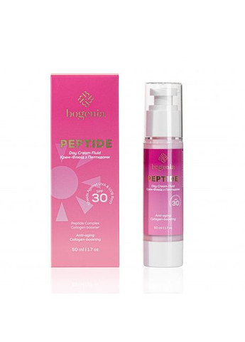 Дневной антивозрастной крем-флюид для лица с пептидами Bogenia SPF 30, 50 мл Легкий крем-флюид Bogenia с SPF 30 – это ежедневный антивозрастный уход, сочетающий мощный пептидный комплекс и солнцезащитный фильтр. Средство эффективно борется с морщинами, предотвращает фотостарение и поддерживает упругость кожи. Уже через несколько недель регулярного использования лицо имеет гладкий, свежий и сияющий вид. Основные свойства: сглаживает морщины и предотвращает появление новых; защищает кожу от УФ-излучения и фотостарения (SPF 30); повышает тонус и упругость; увлажняет без эффекта жирности; обеспечивает комфорт и защиту кожи на протяжении всего дня. Активные компоненты: пептидный комплекс – стимулирует выработку коллагена, укрепляет структуру кожи, уменьшает глубину морщин и поддерживает молодость; солнцезащитный фильтр SPF 30 — эффективно защищает клетки от вредного воздействия UVA/UVB-лучей, предотвращая пигментацию и потерю упругости; увлажняющие агенты – поддерживают оптимальный водный баланс, обеспечивая гладкость и мягкость кожи. Кому подходит Крем созданный для женщин, стремящихся сохранить молодость и упругость кожи, а также желающий защитить ее от ежедневного воздействия солнца. Подходит для всех типов кожи – нормальной, сухой и комбинированной. Преимущества: обеспечивает двойной эффект: уход + защита от солнца; легкая текстура идеально подходит для повседневного использования; не оставляет белых следов и не перегружает кожу; делает кожу гладкой, подтянутой и ухоженной. Нанесите небольшое количество крема-флюида на очищенную кожу лица и шеи утром после очищения. Используйте каждый день для максимального антивозрастного и защитного эффекта. Наиболее эффективно крем работает с другими средствами пептидной серии по уходу за лицом Bogenia. Флакон 50 мл с дозатором.