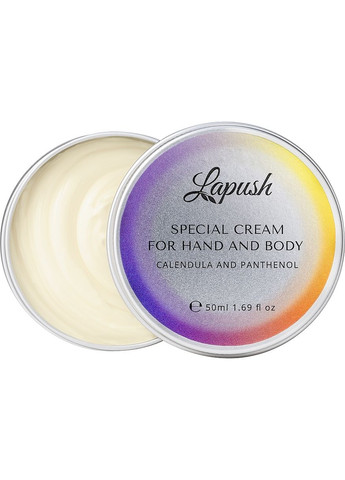 Уязвимая кожа рук особенно категорически реагирует на агрессию окружающей среды, сигнализируя о собственном дискомфорте сухостью, тусклостью, шелушениями и покраснениями. Чтобы уберечь ее от негативного влияния внешних факторов, избавиться от существующих несовершенств и предотвратить их повторное формирование – используйте специальный защитный крем от украинского бренда Lapush. Нежная консистенция, обогащенная натуральным экстрактом календулы и пантенолом, не оставляет шансов существованию преждевременным возрастным изменениям, признакам дегидратации и провоцирующих дискомфорт. Special Cream For Hand And Body справляется с питанием, увлажнением, восстановлением эпидермиса, повышая его упругость, эластичность, гладкость. Особенности Special Cream For Hand And Body от Lapush: - изготовлен на основе из натуральных компонентов; - деликатный состав адаптирован к ежедневному уходу за всеми типами кожи; - способствует ее интенсивному питанию, увлажнению, восстановлению; - образует на поверхности рук невесомую защитную пленку; регенерацию тканей, клеточное обновление; - пантенол участвует в естественном процессе заживления ран; - противодействует свободным радикалам – предвестникам фотостарения; - активно борется с имеющимися признаками дегидратации; изменений; - эфирное масло карите укрепляет защитный барьер, липидную мантию кожи; - заметно выравнивает ее оттенок и разглаживает рельеф; - возвращает упругость, эластичность с шармом природного сияния; заботится о здоровье ногтей, утолщая их структуру; не оставляет шансов существованию желтизны, ломкости, расслоению.
