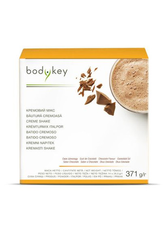 С bodykey от Nutrilite™ вы можете наслаждаться вкусным молочным коктейлем в любое время и в любом месте. Сухая смесь bodykey от Nutrilite™ – отличный вариант перекуса для тех, кто ведет активный образ жизни и следит за своей фигурой. Почувствовав первые признаки голода, просто приготовьте молочный коктейль, благодаря которому вы сможете: быстро перекусить в любой обстановке; дать своему организму необходимый заряд энергии. сделать рацион более сбалансированным; поддерживать оптимальный вес; насладиться ярким шоколадным вкусом. Каждая порция сухой смеси bodykey от Nutrilite™: упакована в индивидуальный пакетик; не содержит ГМО. Продукт содержит потенциальные аллергены: белок гороха и коровьего молока. Условия хранения: температура воздуха – до 25°C, относительная влажность – до 70%. Срок годности: 12 месяцев. Страна происхождения: Италия. СОСТАВ: фруктоза, эмульгатор: соевый лецитин, какао порошок, сафлоровое масло, растительный жир в порошке (рафинированное пальмовое масло, глюкозный сироп), загуститель: ксантановая камедь, ароматизатор, концентрат молочного белка, протеин гороха, вещество, предотвращающее комкование: двуокись кремния. КАК ПРИМЕНЯТЬ Раскройте пакетик и высыпьте сухую смесь в стакан или чашку объемом 250 мл. Добавьте молоко и перемешайте. Рекомендуется молоко жирностью 1,5%.