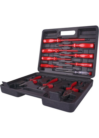 Набор инструментов e.tool.set.8500.11, t009010 Предназначен для выполнения слесарных работ. Артикул t009010 Соответствие стандартам ДСТУ ГОСТ 11516 Способ утилизации передача специализированному предприятию Характеристики Состав набора: шлицевые отвертки:0.5*3.0*75 мм -1шт., 0.8*4.0*100 мм -1шт., 1.0*5. 1.2*6.5*150 мм -1шт.; отвертки крестовые:PH0 3.0*75 мм -1шт., PH1 4.0*100 мм -1шт., PH2 6.0*100 мм -1шт.; отвертка-тестер Ø 3*140 мм -1шт.; кусачки –1шт.; универсальные плоскогубцы –1шт.; круглогубцы -1шт. Гарантия, мисс 12