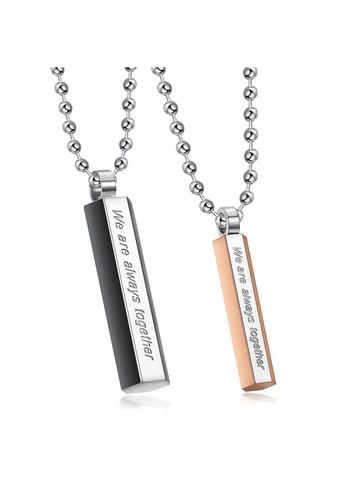 Парные кулончики для влюбленных изготовлены из нержавеющей медицинской стали. Натуральный цвет стали - серебристый, а покрытие на этом материале держится очень хорошо. Медицинская сталь не темнеет, не окисляется и не вызывает аллергической реакции на теле. Нанесена гравировка "We are always together", в переводе означает "Мы всегда вместе". Цепочки имеют прямоугольную форму. Женский имеет покрытие розовой позолоты, а мужской черной эмали. Кулончики сделаны в одном стиле и хорошо сочетаются между собой. Цена указана за два кулончика и две цепочки.