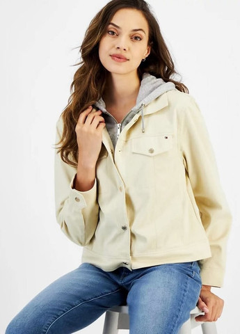 Женская куртка-рубашка Tommy Hilfiger. Оригинальная и удобная куртка-рубашка с двойной застежкой и деталями в стиле худи позволит создать многослойный образ. Капюшон на завязках и вставка с молнией спереди из контрастной трикотажной ткани. Внешний слой застегтвается на кнопки. Отложной рубашечный воротник. Манжеты рукавов на кнопках. Два кармана с клапанами на груди и два боковых кармана. Вышитый флажок бренда на кармане. Есть частичная подкладка спереди на полочках. Отличное качество.