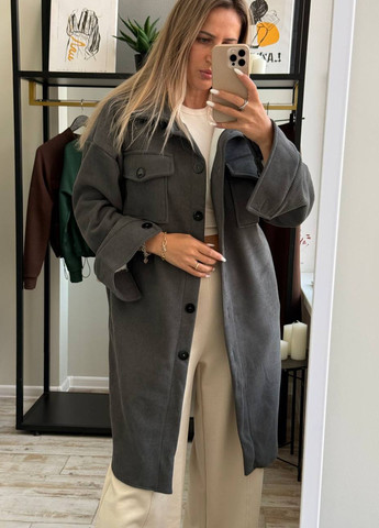 Куртка-рубашка оверсайз из фактурного трикотажа. Воротник, потайные пуговицы спереди и кокетка сзади. Нагрудные карманы с клапаном, заниженная линия плеча и длинные рукава с манжетами на пуговицах. Низ закругленный, сзади чуть длиннее.