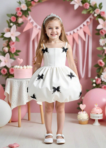 Платье SHEIN Young Girl. Это элегантное платье белого цвета с чёрными объёмными бабочками. Расклешённый подол и высокая талия. Платье без рукавов, короткое. Стирать вручную.