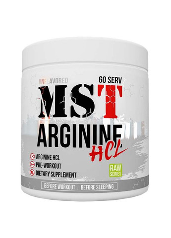 Arginine HCL MST – это источник аминокислоты л-аргинин в форме гидрохлорида. Она используется для улучшения кровоснабжения мышц, стимуляции выработки гормона роста, лучшего восстановления после нагрузок, укрепления иммунитета, ускорения заживления повреждений. Аргинин учавствует в делении клеток, помогает выводить токсические вещества, способствует заживлению травм, в том числе и микроповреждений мышц после тренировки, что ускоряет восстановление. Как принимать: Одну порцию (5 грамм) смешайте с 200-300 мл жидкости. Принимать рекомендуют как перед тренировкой, так и перед сном. Содержание элементов в 1й порции: 5 грамм Аргинин гидрохлорид 5000 мг