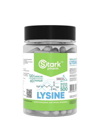 Комплексная пищевая добавка Stark Pharm - Stark Lysine Mega caps содержит L-лизин, который относится к незаменимым аминокислотам, которые не синтезируются в организме человека и должны обязательно поступать с продуктами питания или с добавками. Действие добавки: Повышение физической работоспособности Усиление иммунитета Повышение общей энергии организма Ускорение процессов регенерации тканей и заживление ран Повышение усвояемости кальция Улучшение синтеза коллагена и противостояние его чрезмерному выведению из организма Нормализация эмоционального состояния Улучшение концентрации внимания Улучшение состояния кожи, волос и ногти Антибактериальный эффект Одна капсула содержит: L-лизин гидрохлорид – 500 мг Дополнительные компоненты: Желатиновая капсула Рекомендации по применению: Добавка может быть рекомендована в качестве дополнительного источника лизина. Продукт следует использовать по рекомендации тренера или по назначению врача. Способ применения: Взрослым по 1 порции (2 капсулы) 1-3 раза в день. Употребляйте независимо от приема пищи, запивая стаканом воды.