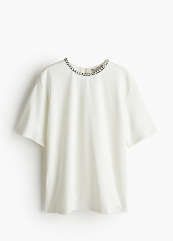 Блуза свободного кроя из плотного трикотажа с круглым вырезом горловины, украшенной цепочкой, короткими рукавами и вырезом-замком со скрытой застежкой на крючок сзади на горловине.