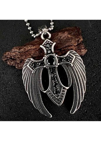 Крестик, подвеска, кулон из нержавеющей медицинской стали в готическом стиле. Украшен крыльями ангела и круглыми черными камнями. Натуральный цвет стали - серебристый. Медицинская сталь не темнеет, не окисляется и не вызывает аллергической реакции на теле. Цепочка идет в комплекте такая как на фото.