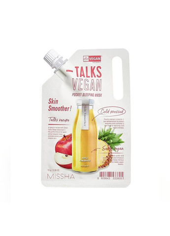 Ночная отшелушивающая маска MISSHA Talks Vegan Squeeze Pocket Sleeping Mask Skin Smoother, 10 г Ночная отшелушивающая маска для лица MisshaTalks Vegan Squeeze Pocket Sleeping Mask Skin Smoother станет настоящей находкой для современной девушки. Свойства: Удаляет ороговевшие клетки, помогая сделать кожу мягкой и выровнять её рельеф. Регулирует выработку себума и процесс естественного кератинизации кожи. Насыщает кожу антиоксидантами и витаминами. Маска имеет сбалансированный pH 5.5. Удобна для путешествий благодаря компактному размеру. Применение После очищения и тонизирования кожи лица, вместо крема нанесите необходимое количество маски как завершающий этап вечернего ухода перед сном. Состав: Purified Water, Glycerin, Propanediol, Phenyl Trimethicone, Trehalose, Butylene Glycol, Sodium Polyacrylate, Dipropylene Glycol, Pyrus Malus (Apple) Fruit Extract, Ananas Sativus (Pineapple) Fruit Extract, Hydrolyzed Jojoba Esters, Gluconolactone, Dipotassium Glycyrrhizate, Citric Acid , Hydroxyacetophenone, Hydroxypropyl Starch Phosphate, C12-16 Alcohols, Caprylyl Glycol, Hydrogenated Lecithin, Palmitic Acid, Sodium Phytate, Coptis Chinensis Root Extract, 1,2-Hexanediol, Tromethamine, Ethylhexylglycerin, Denatured (Sd) Alcohol, Fragrance.