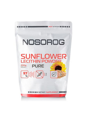 Nosorog Sunflower Lecithin Powder - состоит из подсолнечного лецитина, соединительного вещества, которое необходимо для здорового функционирования практически всех жизненно важных органов.Преимущества:В обычных условиях достаточное количество лецитина из обычных продуктов питания получить достаточно сложно, поскольку в них содержится всего 10-20% фосфотидилхолина – главного действующего компонента лецитина. В Nosorog Sunflower Lecithin Powder, 200 грамм содержится до 97%!!! фосфолипидов.Как принимать:Принимают по 2 мерные ложки в день (10 грамм), смешивая продукт с едой или употребляя отдельно во время еды.Содержание элементов в 1й порции10 грамм, Калории 80 ккал, Жиры 5 г, - насыщенные 1 г, - транс жиры 0 г, - полиненасыщенные 2,5 г, - мононенасыщенные 1,5 г, Холестерин 0 мг, Натрий 0 мг, Калий 80 мг, Углеводы 1 г, - пищевые волокна 0 г, - сахар 0 г, Белок 0 г, Ингредиенты, подсолнечный лецитин