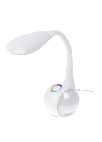 светодиодная настольная лампа SL-91 LED 8W WH изготовлена из пластика, конструкция состоит из основания, гнущейся резиновой ножки и рассеивателя света продолговатой формы. Благодаря гнущейся ножке можно изменять угол наклона света, а, соответственно, и площадь освещения. Настольная лампа окрашена в белый цвет. Источником света служат мощные светодиоды с нейтральным оттенком цвета свечения. Мощность составляет 8 Вт, коэффициент цветопередачи больше 80%. Данная настольная лампа оборудована сенсорной кнопкой, посредством которой можно включать/выключать осветительный прибор, регулировать яркость освещения (3 уровня). Вторая сенсорная кнопка, которая тоже расположена на основании, позволяет управлять RGB подсветкой, встроенной в основание. Для того, чтобы изменить цвет основания необходимо прикоснуться к сенсорной кнопке пальцем. Цвет меняется автоматически или же можно выбрать необходимый цвет самостоятельно. Светится она тремя основными цветами – красным, зеленым, синим и их оттенками. Если оставить включенной только подсветку, настольную лампу можно смело использовать в качестве ночника в детской. Ширина: 130 мм. Длина: 450 мм. Высота: 650 мм