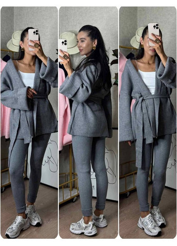 ПАРАМЕТРЫ Кардиган (one size) Длина 80 см ОГ 120 см Рукав от ворот 80 см Леггинсы (хорошо тянутся) Длина 104 см/106 см. ОБ 89-95 см/95-102 см ОТ 62-68 см/70-76 см Женский костюм из вязаной ангоры – стильное сочетание комфорта и современных тенденций, которое станет идеальным выбором для повседневной носки. Комплект состоит из двух элементов: кардигана с поясом и узких брюк-леггинсов в рубчике, которые создают гармоничный образ и подчеркивают фигуру. Кардиган имеет свободный фасон с широкими рукавами и удобным поясом на талии, позволяющим регулировать посадку и делать силуэт более женственным. Его можно носить как в застегнутом виде, так и набрасывать поверх топов или футболок, используя как стильную альтернативу жакету. Вязаные фактурные рубчики придают модный акцент и создают эффектный внешний вид. Брюки-леггинсы выполнены в том же стиле: они эластичны, комфортны и хорошо адаптируются под фигуру, подчеркивая линии ног. Высокая талия обеспечивает удобство и придает чувство уверенности во время ношения. Манжеты внизу брюк аккуратно фиксируют их на лодыжках, создавая завершенный и аккуратный вид. Комплект изготовлен из мягкого трикотажа, приятного для тела, сохраняющего тепло, но одновременно позволяет коже дышать. Такой костюм идеально подходит для повседневных прогулок, путешествий, отдыха на дому или встреч в непринужденной атмосфере. Он легко сочетается с кроссовками, лоферами или даже сапогами для создания разных стилистических решений.