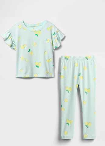Детский комплект GAP. Комплект для девочек, в который входит футболка и леггинсы. Стильная и удобная футболка из мягкой, приятной к телу ткани. Круглый вырез. Короткий рукав в виде воланов. Красивые леггинсы. Эластичный пояс на резинке. Принт лимоны по всей поверхности комплекта. Отличное качество.