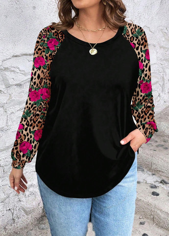 Эта футболка с длинным рукавом обеспечивает свободный крой. На ней изображен цветочный и леопардовый принт. Изделие подходит для ношения осенью и зимой. Имеет круглый вырез и слегка эластичную ткань. Подол имеет регулярную форму.