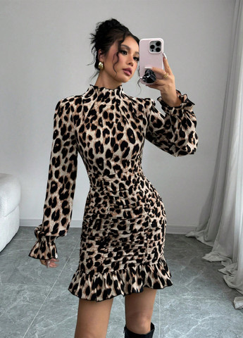 Это платье с леопардовым принтом включает оборки и складчатые детали на подоле. Платье имеет расклешенные рукава и высокую талию. Ткань не тянется.