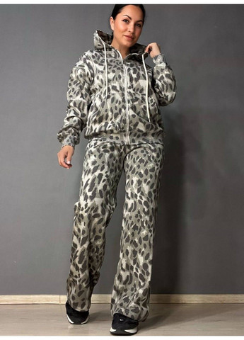 Костюм имеет насыщенную, одновременно универсальную окраску в оттенках серого с принтом под леопард — подходит как для ежедневного ношения, так и для создания трендовых лугов.