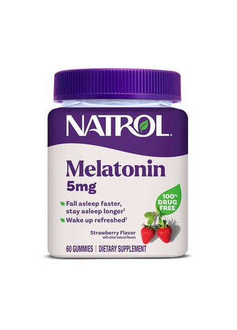 Засыпайте быстрее Безопасный и эффективный для 4 лет 100% без лекарств С другими натуральными ароматизаторами Пищевая добавка №1 бренд снотворных средств без лекарств Помогает вашему ребенку лучше спать Natrol® Melatonin помогает вашему ребенку быстрее уснуть. Мелатонин естественным образом производится в организме, чтобы помочь установить нормальный спящий режим. Такие факторы, как нарушение ночного распорядка и время, проведенное перед экраном перед сном, могут прерывать выработку мелатонина и нарушать сон. Этот продукт полезен при эпизодической бессоннице. Качественные ингредиенты, которым можно доверять: Не формирует привыкание Без искусственных ароматизаторов Без искусственных подсластителей Без синтетических красителей БЕЗ ГМО Вегетарианский и без желатина Рекомендуемое использование Детям в возрасте от 4 лет принимать 1 жевательную конфету за 30 минут до сна. Тщательно разжевать перед проглатыванием. Другие ингредиенты Сироп тапиоки, тростниковый сахар, вода содержит 2 процента или меньше (карнаубский воск, лимонная кислота, кокосовое масло, натуральные ароматизаторы, фруктовый и овощной сок (краситель), пектин, цитрат натрия).