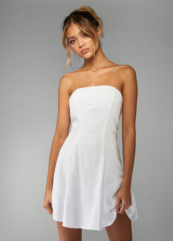 Льняное мини-платье без бретелек MISSGUIDED. Это белое мини-платье свободного кроя. Платье имеет среднюю линию талии и расклешенный подол. Платье имеет застежку-молнию. Идеально подходит для свадеб и летних мероприятий.