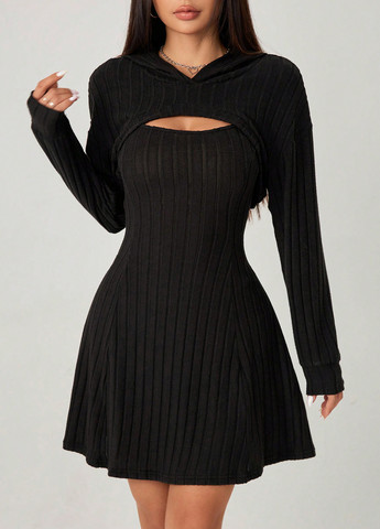 Женский весенне-летний комплект из топа и платья Petite состоит из двух частей. Имеет вырез с капюшоном и рукава с заниженной линией плеч. Одежда изготовлена из эластичной ткани.
