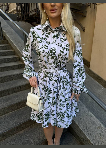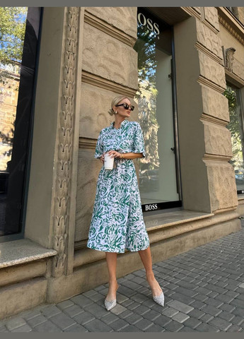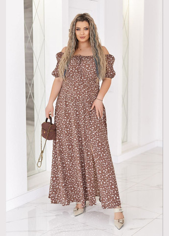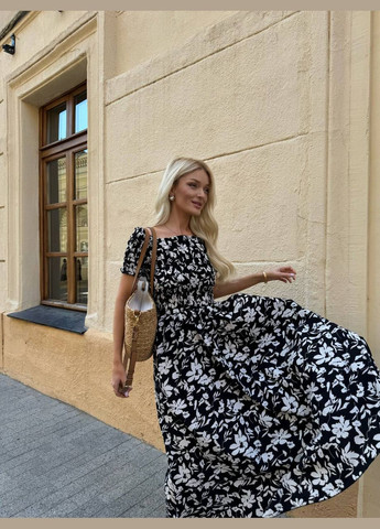Женское платье из софта с мелким белым принтом. Длина платья - макси, что придает ему изящества и универсальности. Платье имеет свободный, слегка расклешенный крой, что делает его удобным и подходящим для разных типов фигур. Рукава короткие, на резинке, что создает эффект «спущенных плеч», придавая образу романтичности. По лифу идет резинка есть декоративная завязка. По спине потайная молния, которая делает платье удобным для надевания без лишних застежек на виду. Ткань легкая, что делает его удобным и стильным вариантом для повседневного или летнего гардероба.