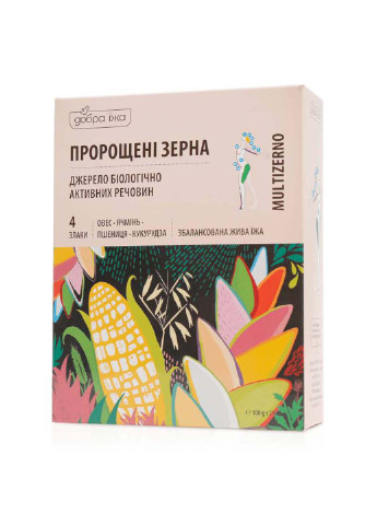 ИСТОЧНИК БИОЛОГИЧЕСКИХ АКТИВНЫХ ВЕЩЕСТВ . 4 ЗЛАКА: ОВЕС + ЯЧМЕНЬ + ПШЕНИЦА + КУКУРУДЗА - БАЛАНСИРОВАННАЯ ЖИВАЯ ЕДА Пророщенное зерно – сбалансированная живая пища. Это отличный источник витаминов и полезных веществ. Способствует улучшению обменных процессов и нормализации функций желудочно-кишечного тракта. . ПИЩЕНИЕ: Нормализует работу желудочно-кишечного тракта Восстанавливает процессы пищеварения . ОБМЕННЫЕ ПРОЦЕССЫ: Пополняет запасы питательных веществ Нормализует обменные процессы Корректирует общий тонус организм . СЕРДЕЧНО-СОСУДИСТАЯ СИСТЕМА: Улучшает функции сердечно-сосудистой и кровеносной систем Снижает содержание холестерина . ДИАБЕТ/ОЖИРЕНИЕ: Регулирует вес Способствует нормализации уровня сахара в крови Состав: Измельченные пророщенные зерна овса, ячменя, пшеницы, кукурузы. Витаминный состав : А, Е, В1, В2, В6, В5, В9, Н, холин, ниацин, РР, С. Минеральный состав: Бор, селен, хром, железо, ванадий, марганец, цинк, йод, медь, фтор, калий, кальций, кремний, магний, фосфор. Аминокислоты: валин, изолейцин, лейцин, лизин, метионин, треонин, триптофан, фенилаланин, аланин, аргинин, аспарагиновая кислота, гистидин, глицин, глутаминовая кислота, пролин, серин, тирозин, цистин. Ферменты: Амилаза, протеаза, липаза. . Энергетическая ценность (калорийность) /100 г: 312 Ккал/1307 кДж Пищевая (питательная) ценность /100 г: белки – 11.1, жиры – 1.9, углеводы – 62.5. Пророщенные зерна злаков — основа продукции бренда «Хорошая Еда» . Максимальная адаптивность: Злаки – это основа нашего рациона с давних времен Гидролизная ферментация и ферментативная пауза: Специальная запатентованная технология проращивания зерен увеличивает содержание витаминов, аминокислот, растительных белков, активных ферментов и фитогормонов в конечном продукте Принцип синергии: Состав продуктов бренда «Добра Еда» подобран таким образом, что все компоненты взаимно усиливают действие друг друга . Синергизм пророщенных зерен Концентрированный комплекс всех питательных веществ. Полезные вещества проращенных зерен в уже доступной форме полностью усваиваются организмом человека . РЕКОМЕНДОВАНО ПРИМЕНЯТЬ всем, кто хочет быть здоровым и активным