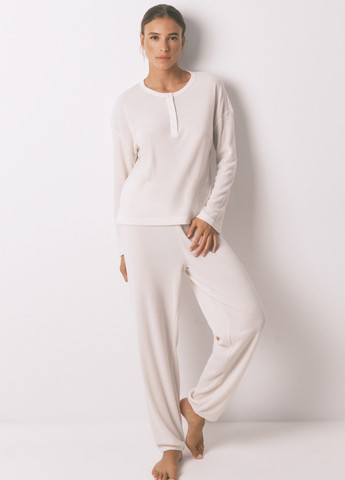 Верх — приталенный лонгслив с длинным рукавом и круглым воротником. Он плотно прилегает к телу, не создает дискомфорт и надежно сохраняет тепло даже под верхней одеждой.