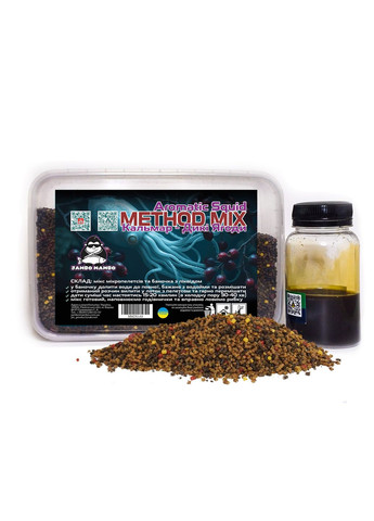 Метод-микс 2в1 JamboMambo Aromatic Squid (кальмар – дикие ягоды). Всесезонный, универсальный. Необычайно эффективен аромат кальмара с дикими ягодами. Предназначен для использования в флэт-фидере или классическом фидере, изготовление стик-миксов в классическом карпфишинге, или как обычную прикормку во время ловли рыбы. Основное предназначение ловли карпа, белого амура, карася, леща и т.д. Может использоваться для изготовления стик-миксов в классическом карпфишинге, но в этом случае воду в баночку к ликвиду лучше не добавлять, а вылить содержимое в лоток с миксом, перемешать и дать время настояться. Приготовленный таким образом микс не портится длительно и может быть использован следующей рыбалки, даже без холодильника. Набор содержит основные элементы микса, без лишних приложений – 400 граммов специально подобранной смеси пеллеты + баночка с ликвидом. Способ использования для флет-фидера: - долить в баночку воды из водоема в полную, размешать и вылить все содержимое в лоток с пеллетсом; - хорошо перемешать, закрыть лоток крышечкой и дать настояться 10-20 минут. В условиях низких температур время для всасывания ликвидации миксом следует существенно увеличить, а лучше замешать еще до выезда на рыбалку в теплом месте. Смесь пеллетсов подобрана для оптимальной работы и создания мощного пищевого сигнала, действующего как магнит на рыб семейства карповых. При правильном увлажнении согласно инструкции, смесь не выпадает из кормушки даже при мощных дальних забросах, но при этом на дне водоема быстро распадается и создает мощный привлекательный эффект. Смесь протестирована нашей командой на диких водоемах и в режиме спортивных соревнований. Все компоненты изготовлены из высококачественной муки морских рыб, рафинированного рыбьего жира и экструдированных зерновых. Находящийся во флаконе ликвид не растворяет ПВА до момента добавления в него воды и может быть использован как дип для стеков.