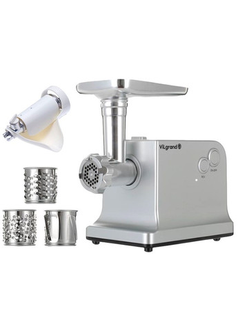 Мясорубка ViLgrand V221-PMG позволяет превратить в фарш любые виды мяса. Корпус сделан из крепкого пластика. Лоток, горловина и шнек - из анодированного алюминия. Мясорубка оснащена функцией реверса (обратного хода), тремя перфорированными дисками для изготовления фарша разной консистенции, а также надёжной системой, которая защищает двигатель от перегрева. Насадка з терками и шинковкой овощей и фруктов облегчит приготовление любимых блюд, а насадка для приготовления дерунов позволит побаловать себя и близких дерунами или натереть пармезан для пиццы. В комплекте есть насадки для кеббе и колбасных изделий. А насадка для приготовления сока позволит Вам наслаждаться любимыми соками хоть каждый день! Мощность, макс. 2200 Вт Номинальное напряжение: 220 В Номинальная частота: 50 Гц Медная обмотка мотора Материал корпуса: пластик Материал загрузочного лотка: нержавеющая сталь система реверса Количество скоростей: 1 Защита двигателя от перегрузки Материал ножей: нержавеющая сталь Количество ножей: 3 дисковых Диаметр отверстий в дисковых ножах: 3, 5 и 7 мм Длина сетевого шнура: 1,35 м Габаритные размеры: 33,8 х 18 х 32,5 см