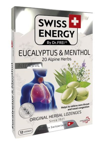 Herbal Lozenges Blister 20 herbs + Eucalyptus and Menthol от Swiss Energy — это натуральные леденцы для рассасывания, созданные по традиционному швейцарскому рецепту • Содержат природный эвкалипт и ментол • Снимают заложенность носа и смягчают горло • Традиционный швейцарский рецепт из 20 горных трав