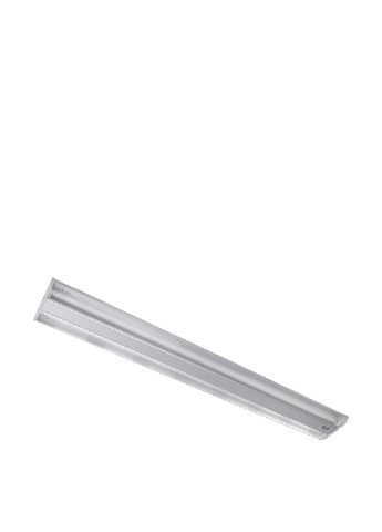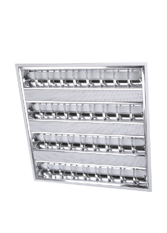 Подвесной светильник на две люминесцентные линейные лампы. Его корпус изготовлен из литого алюминия, окрашен в серый цвет. Решётка, закрывающая лампы, выполнена из пластика и окрашена в цвет металла. Светильники такого типа крепятся на потолок при помощи специальных металлических тросов. Люминесцентные лампы, используемые в этом светильнике, отличаются большой излучающей поверхностью, но как следствие, она менее яркая, чем у «точечных» источников света - ламп накаливания, галогенных ламп и т.п. Эти лампы также называют лампами дневного света, ведь их свет очень похож на дневной, он позволяет различать цвета так же точно, как и при естественном освещении. Существует множество ламп с разной цветностью, она зависит от сорта люминофора, который используется в конкретной лампе. Цвета могут варьироваться от холодных с голубоватым оттенком до тёплых, жёлтых. Кроме того, люминесцентная лампа потребляет в 4-5 раз меньше энергии, чем лампа накаливания с той же светоотдачей, да и служит она дольше (до 18 000 часов). Также её несомненным преимуществом является низкая температура колбы (до +40 градусов).