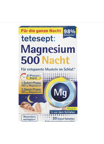 Описание продукта 500 мг магния для нормальной функции мышц и нервной системы 1-х высокая доза перед сном 2-фазное депо Выплетайте таблетки магния на ночь, обеспечивающие организм высокодозированным магнием. Это способствует нормальной работе мышц и нормальному функционированию нервной системы. При употреблении вечером организм снабжается магнием в течение ночи, благодаря 2-фазному депо. Рекомендуемое применение: Ешьте 1/2 – 1 таблетка ежедневно с достаточным количеством жидкости. При повышенных потребностях магния, например, из-за сильного стресса на работе и во время физических упражнений и в сочетании с низкомозговой магниевой диетой, потребляйте 1 таблетку. Чтобы дополнить пищу, ешьте только 1/2 таблетки. Рекомендуемый ежедневный прием не должен превышаться. Может возникнуть слегка слабительный эффект. Не следует дополнительно принимать какие-либо другие препараты, содержащие магний. Пищевые ценности Композиция На суточную дозу* % NRV** Магний 500 мг 133%