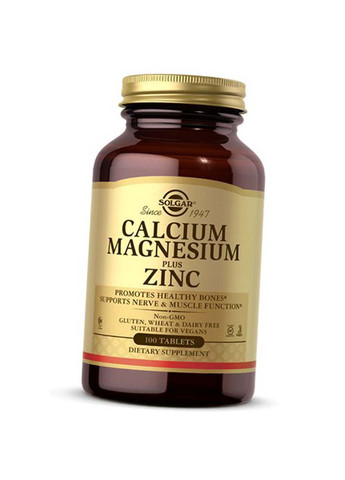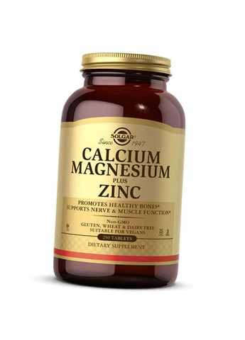 Calcium Magnesium Plus Zinc от Solgar поддержит в норме Ваше физическое и эмоциональное здоровье! Кальций, магний и цинк – три элемента, которые напрямую влияют на состояние костей, зубов, ногтей, кожи, сердца, протекание жизненно важных процессов в организме человека, а также на эмоциональное здоровье. Конечно, есть возможность пополнить запасы этих важных микроэлементов извне, вместе с пищей, но не все питаются правильно и сбалансировано. Поэтому нет гарантии, что такие важные элементы будут доступны организму в нужном количестве. Эффективными помощниками станут специальные комплексы на их основе, одним из которых является продукт Calcium Magnesium Plus Zinc от американской компании Solgar. Это грамотно подобранное сочетание кальция, магния и цинка для обеспечения полноценного функционирования опорно-двигательного аппарата, поддержания зубов и ногтей в здоровом состоянии, улучшения кожи, а также поддержки сердечно-сосудистой и нервной системы в норме. Такое положительное воздействие после включения комплекса в ежедневный рацион происходит благодаря сильному составу. Кальций – уникальный компонент, который не только делает костную ткань более плотной и крепкой, но и принимает участие в полноценном сокращении мышц. Именно кальций защищает человека от развития таких болезней как остеохондроз, артрит, искривление позвоночника, грыжа, артроз, а также предотвращает периодическое спазмирование мышечной ткани, онемение конечностей и судороги. Этот элемент параллельно отвечает за свертываемость крови, синтезирует ряд ферментов, ускоряет обмен веществ, влияет на качество сна и настроение, а также помогает проникать через клеточные мембраны другим полезным веществам. На работу нервной системы влияет еще один компонент Calcium Magnesium Plus Zinc – магний. Он снимает раздражительность, способствует расслаблению организма, борется с развитием депрессии. Более того, именно магний помогает правильно распределиться кальцию, препятствуя отложению излишков. Магний положительно влияет на эндокринную и сердечно-сосудистую систему, стимулирует работу мозга, улучшает память и концентрацию внимания, а также выводит токсины. Цинк – третий компонент комплекса, идеально гармонирующий в нем. Этот элемент укрепляет кости, зубы, ногти, улучшает состояние кожи. Поэтому он включен в большинство косметических средств по уходу за проблемной кожей, а также в детскую косметику. Цинк дополнительно нормализует уровень сахара в крови, помогает полноценному усвоению витамина А, заживляет раны, ссадины и другие повреждения, а также активизирует мозговую деятельность. Calcium Magnesium Plus Zinc от Solgar – это качественный комплекс для поддержания здоровья на высоком уровне, улучшения настроения и внешнего вида! Состав: Состав на порцию - 3 таблетки: Кальций (в виде карбоната кальция, глюконата кальция, цитрата кальция) 1000 мг Магний (в виде оксида магния, глюконат магния, цитрат магния) 400 мг Цинк (в качестве глюконата цинка) 15 мг Другие ингредиенты: микрокристаллическая целлюлоза, растительный глицерин, диоксид титана (цвет), растительная стеариновая кислота. Без: клейковины, пшеницы, молочных продуктов, сои, дрожжей, сахара, натрия, искусственного вкуса, подсластителя и консервантов. Как принимать: Употреблять по 3 таблетки ежедневно, желательно во время еды. Предупреждения: Не использовать, если 