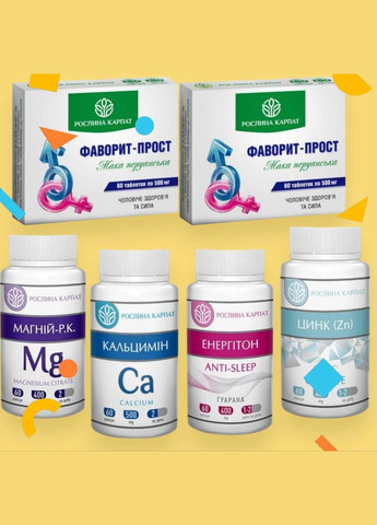 Магазин "РОСЛИНА" предлагает купить Программа Энергия мужской силы, Фаворит прост, Магний РК, Кальцимин, Энергитон, Цинк, 360, производитель Рослина Карпат. Восстанавливает баланс мужской силы, улучшает микроциркуляцию крови, противовоспалительный эффект.