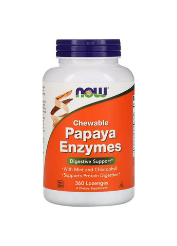 NOW Papaya Enzyme имеют освежающий вкус и поддерживают пищеварение после еды. Способность организма вырабатывать ферменты уменьшается с возрастом, изза этого эффективность пищеварения снижается.Таблетки состоят из порошка папайи. Кроме того, протеаза, липаза и целлюлаза были включены для полного спектра ферментативной активности. Эта таблетка также полезна как освежитель дыхания.Как принимать:Взрослым по 2 таблетки после еды или по мере необходимости.Детям (старше 4 лет) 1 таблетка после еды или по мере необходимости.Содержание элементов в 1й порции2 таблеткиКалории 5 ккалУглеводы 2 гСахарные спирты (сорбит и маннит) 1 гПапаин (из папайи) (2000 USP/мг) 100 мгФруктовый порошок папайи 80 мгБромелайн (из ананаса)(2400 GDU/г) 20 мгПротеаза (5000 FCC/г) 20 мгЛипаза (10000 USP/г) 2 мгЦеллюлаза (4000 FCC/г) 0,6 мгАльфа-амилаза (25000 USP/г) 2 мгИнгредиентыстеариновая кислота (растительный источник), стеарат магния (растительный источник), диоксид кремния, порошок мяты перечной, масло мяты перечной и натрий-медный хлорофиллин (хлорофилл).